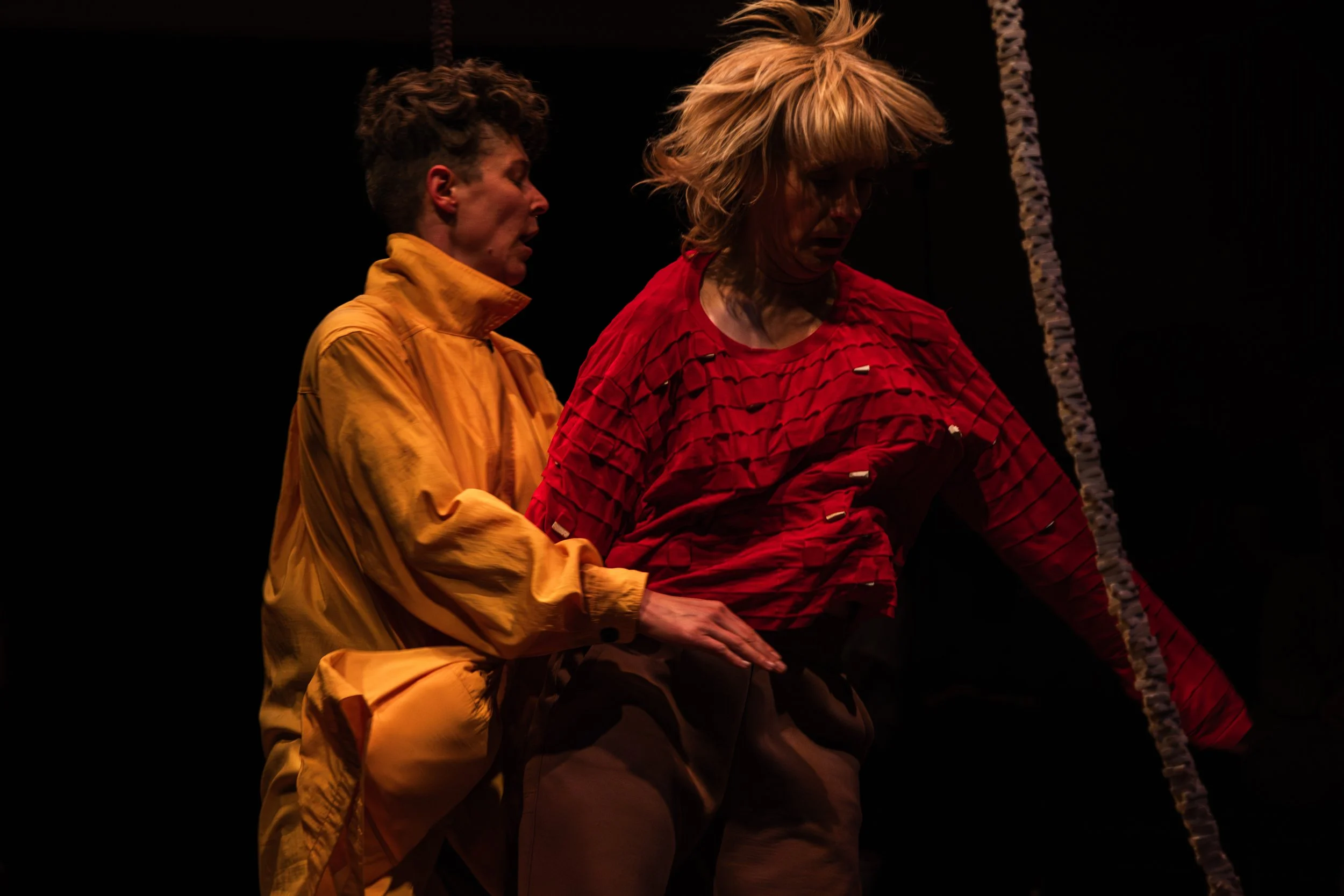 A Body (Un)Becoming is a dance duet with live musicians that explores the tension between decay and transformation. In this performance, the body meets disintegrating materials through acts of touch, labor, and experimentation. The piece investigates what new forms can emerge through pressure, heat, and attention which is also reflected in the kinetic sculptures made from eggshells. By animating overlooked materials—including an aging female-identified body— the work challenges fixed ideas of being and utility: fragile, reforming, and ongoing.